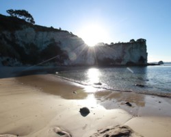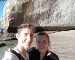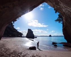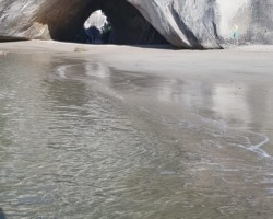 Nach der Gemstone Bay ging es erstmal zum Hauptziel: Cathedral Cove. Nachdem wir die vielen Treppenstufen gemeistert hatten, fanden wir uns vor einem riesigen, natürlich geschaffenen Tunnel wieder, der seiner Berühmtheit mehr als gerecht wurde. Die größte Schwierigkeit war es hier, ein Foto „ohne Leute im Hintergrund“ zu schießen. Nachdem wir das letztendlich geschafft hatten, konnten wir uns noch einige Zeit an diesem wunderschönen Strand entspannen und das gute Wetter genießen. Luca ist noch mit dem Füßen ins kristallklare Wasser gegangen, wurde dann aber doch von den Wellen etwas nass gemacht…