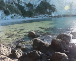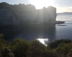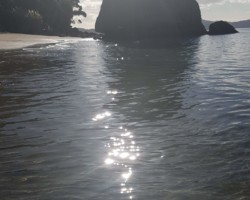 Bei Cathedral Cove, einem der meistbesuchtesten Touristenziele Neuseelands, angekommen, mussten wir erstmal einen geeigneten Parkplatz finden. Der kostenlose Parkplatz trennte uns noch durch einen 40-minütigen Fußweg vom Startpunkt der ebenfalls 40-minütigen Strecke zur Bucht. Leider erlaubte uns unser Zeitplan keine so lange Wanderung. Somit fuhren wir zum 15$-Parkplatz und starteten bei perfektem Wetter unseren Fußmarsch. Luca hatte sich vorher noch kurze Sachen und Flip-Flops angezogen, leider hatten wir dann aber vergessen, uns etwas zu trinken mitzunehmen. Der steile Weg führte uns zunächst zur Gemstone Bay. Gemstone steht für Edelsteine, was auf diese paradiesische Bucht sehr gut zutrifft. Sehr friedlich kann man auf den vielen Steinen sitzen und dem Wellenrauschen zuhören. Als wir ankamen, waren leider noch ein paar andere Leute da, die sich sehr lautstark unterhielten. Zu unserem Glück sind die aber nach ein paar Minuten gegangen, sodass wir in Ruhe in der Bucht entspannen konnten. Außerdem konnten wir den etwas kleineren Meeresbewohnern, kleinen Krabbeltieren, im Wasser zuschauen und ein paar schöne Fotos schießen.