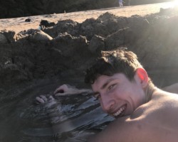 Beim Hot Water Beach angelangt, zogen wir uns entgegen der ersten Überlegung „erst gucken wie es ist, dann umziehen“ direkt Badeklamotten um, liehen uns im Surfshop einen Spaten (für 10$) und machten uns damit auf den Weg zu den heißen unterirdischen Quellen. Zu unserem Glück, haben uns zwei Leute, die den Strand gerade verließen, darauf hingewiesen, dass wir einfach ihren „Spa Pool“ nutzen könnten. Somit mussten wir nicht von Null anfangen sondern konnten uns direkt in deren heißes Becken legen. Bei 14°C Außentemperatur war unsere erste Reaktion, nachdem wir die Wassertemperatur erfühlt hatten: „Das ist doch viel zu heiß, da drin halten wir es niemals aus!“ Nachdem wir uns dann allerdings an die Wassertemperatur gewöhnt und einige Zeit im heißen Wasser entspannt hatten, mussten wir sogar nach neuem, frischen Wasser buddeln, um unseren Pool wieder aufzuheizen. Luca wurde es zwischendurch sogar zu heiß, sodass er sich im kalten Meereswasser abkühlen musste.